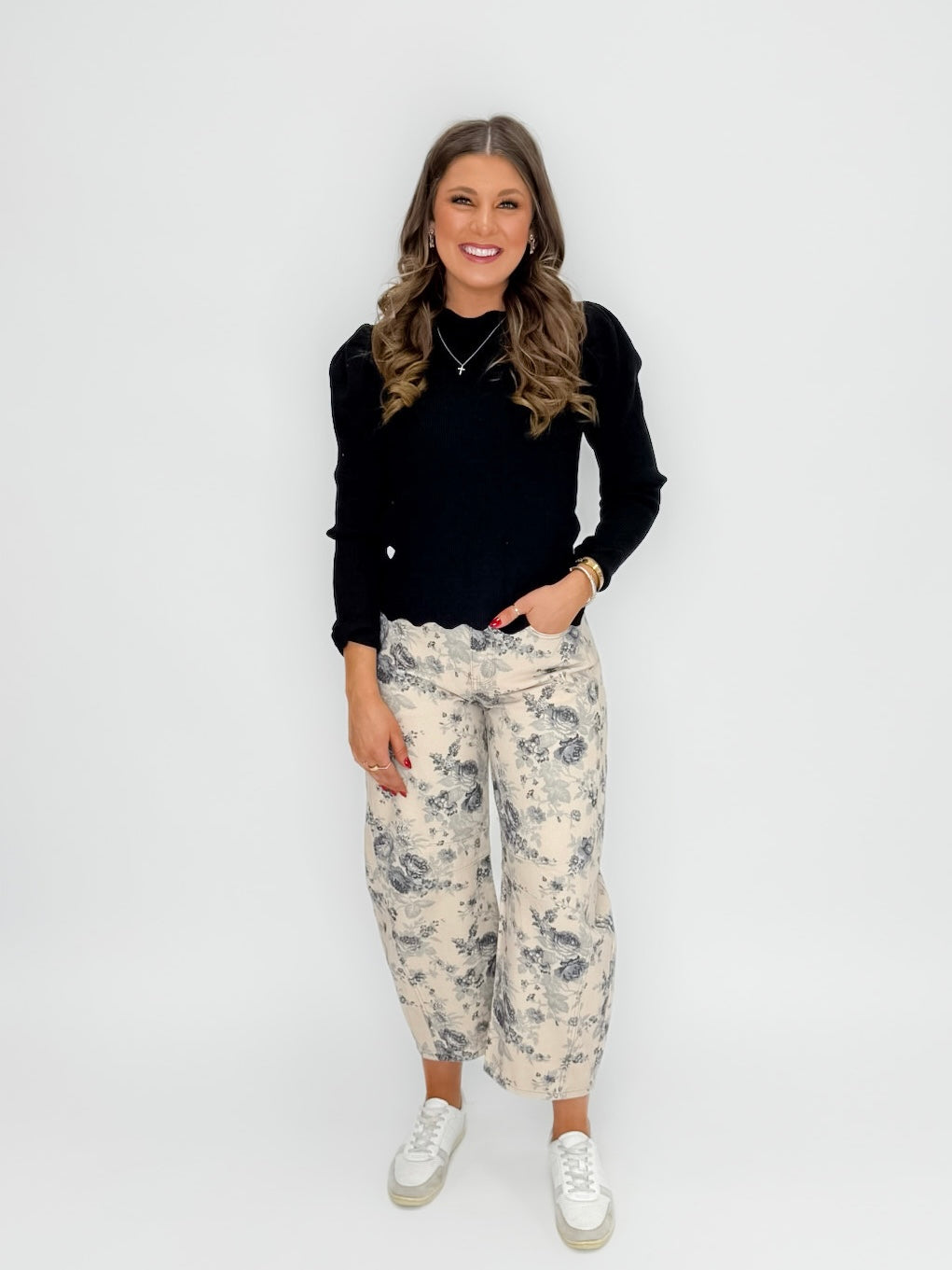 This black scalloped ribbed sweater is a timeless staple with subtle feminine detail. Designed with a fitted ribbed knit and delicate scalloped edging, it offers a flattering silhouette while remaining comfortable and easy to wear. The classic black hue makes it endlessly versatile—perfect for pairing with denim, printed bottoms, or layered under jackets.
