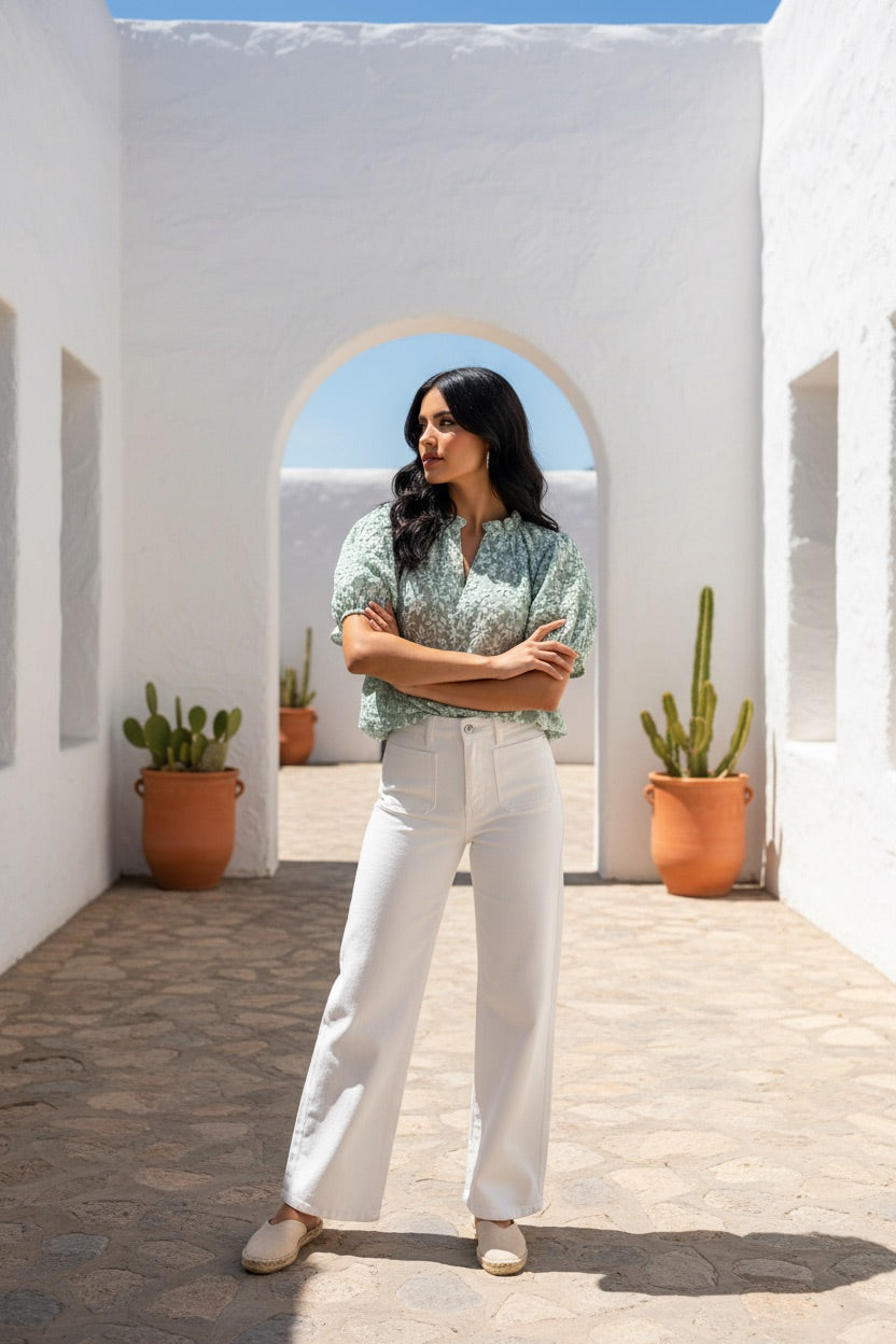 Fresh, feminine, and beautifully textured — this mint and white brocade top is the perfect elevated everyday piece. Designed with a flattering split neckline and statement puff sleeves, the raised floral texture adds just the right amount of interest while keeping the look light and effortless.