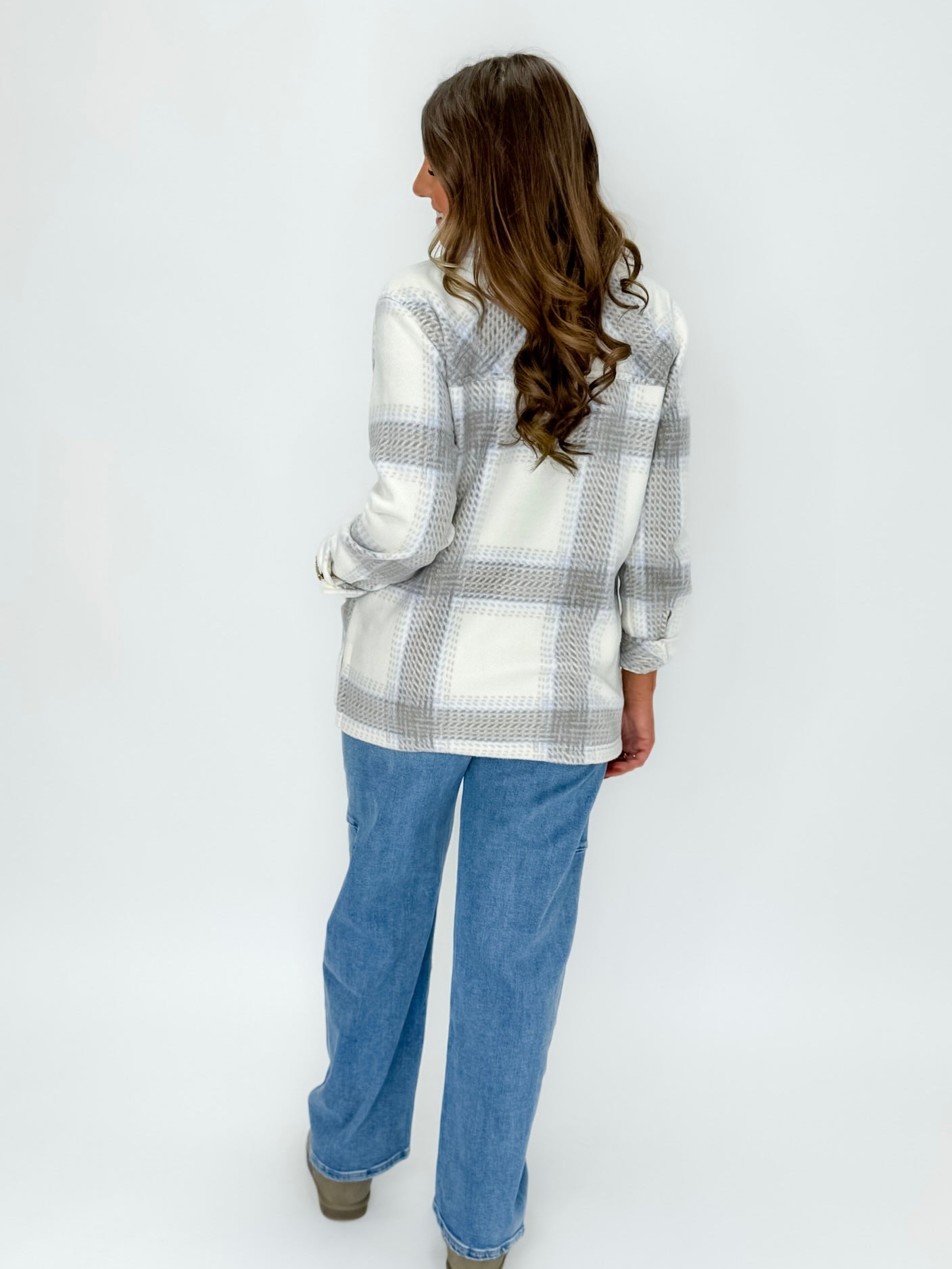 This winter white and grey plaid flannel jacket is the perfect cozy layer for cooler days. Crafted from a soft, brushed flannel fabric, it offers lightweight warmth with an easy, relaxed fit. The classic plaid pattern in soft neutral tones keeps it timeless and versatile, while the button-front design and chest pockets add an effortless, everyday feel.
